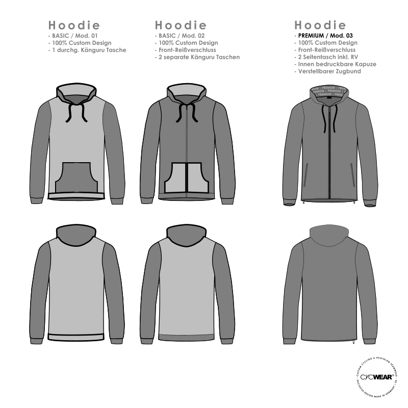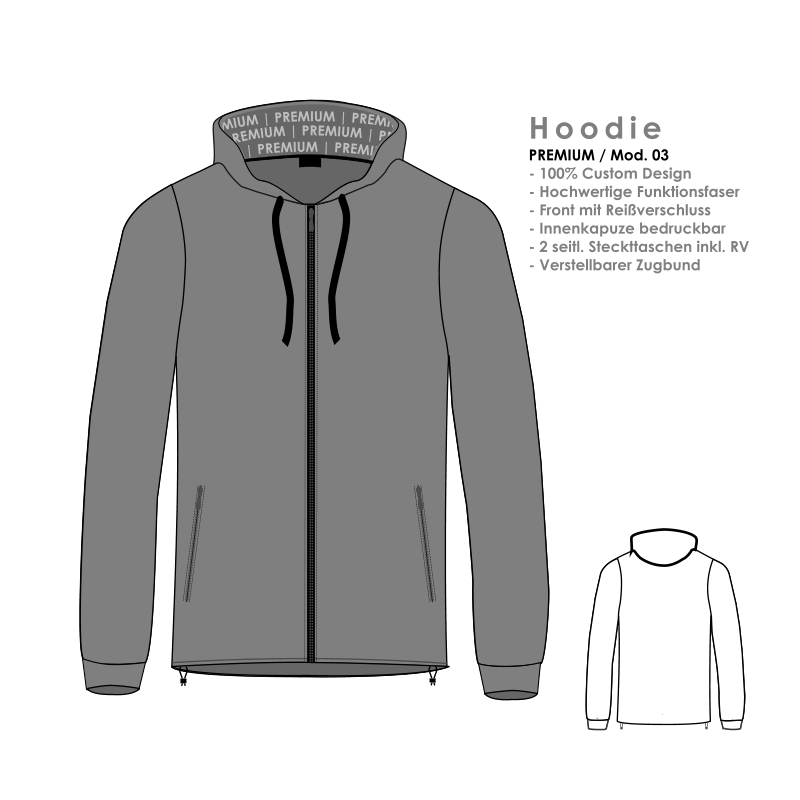 Diesen Artikel bieten wir in 3 möglichen Modellvarianten als hochwertig gearbeitete Hoodies / Kapuzenpullis an sowie aber auch als Hoodie-Jacke bzw. Kapuzenjacken aus Funktionsmaterial. Das Basic Modell ist in Unisex Größen für Erwachsene ab Größe XXS bis hin zu Größe 3XL möglich. Der Premium Hoodie hingegen kann auch als reine Damen- und Herrenschnitt gefertigt werden (Herrengrößen sind zeitgleich Unisex Größen).